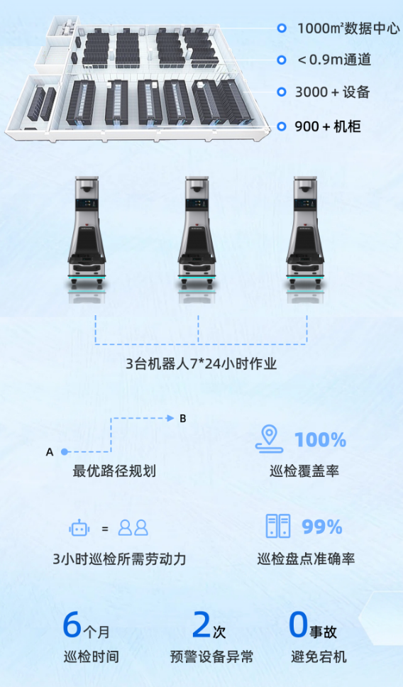 面对大型数据中心内多个机房环境,运维人员通过一个平台统一查看不同地区、不同机房的机器人巡检数据